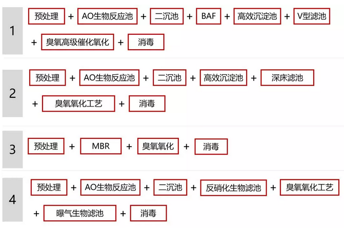 目前類IV類水標(biāo)準(zhǔn)下污水處理廠的大體工藝路線為以下四種類型,被業(yè)內(nèi)評價(jià)為:這是將能用的技術(shù)都用上了,長流程、高耗能、高化學(xué)品投入,更復(fù)雜的運(yùn)行管理,以及更為昂貴的建設(shè)運(yùn)行費(fèi)用,使得穩(wěn)定達(dá)標(biāo)的技術(shù)可行性、經(jīng)濟(jì)性等面臨非常大的挑戰(zhàn)。
