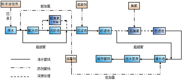 重慶市悅來(lái)水廠二期工程設(shè)計(jì)規(guī)模20×104m3/d,位于重慶市渝北區(qū)悅來(lái)街道及雙龍湖街道,主要工程內(nèi)容包括取水工程、凈水工程、輸配水?dāng)U建工程。水源地選擇在水量充沛、水質(zhì)較好的嘉陵江悅來(lái)段,一期取水工程已按40.0萬(wàn)m3/d進(jìn)行土建,本期設(shè)備增容20.0萬(wàn)m3/d。凈水工程主要生產(chǎn)構(gòu)筑物按20.0萬(wàn)m3/d建設(shè),凈水廠工藝流程采用常規(guī)凈水處理+深度處理工藝。常規(guī)凈水處理工藝為沉砂+絮凝沉淀+過(guò)濾+消毒,深度處理工藝為O3-BAC。管網(wǎng)輸配水能力按2020年60.0萬(wàn)m3/d總體布置,分期分步實(shí)施。