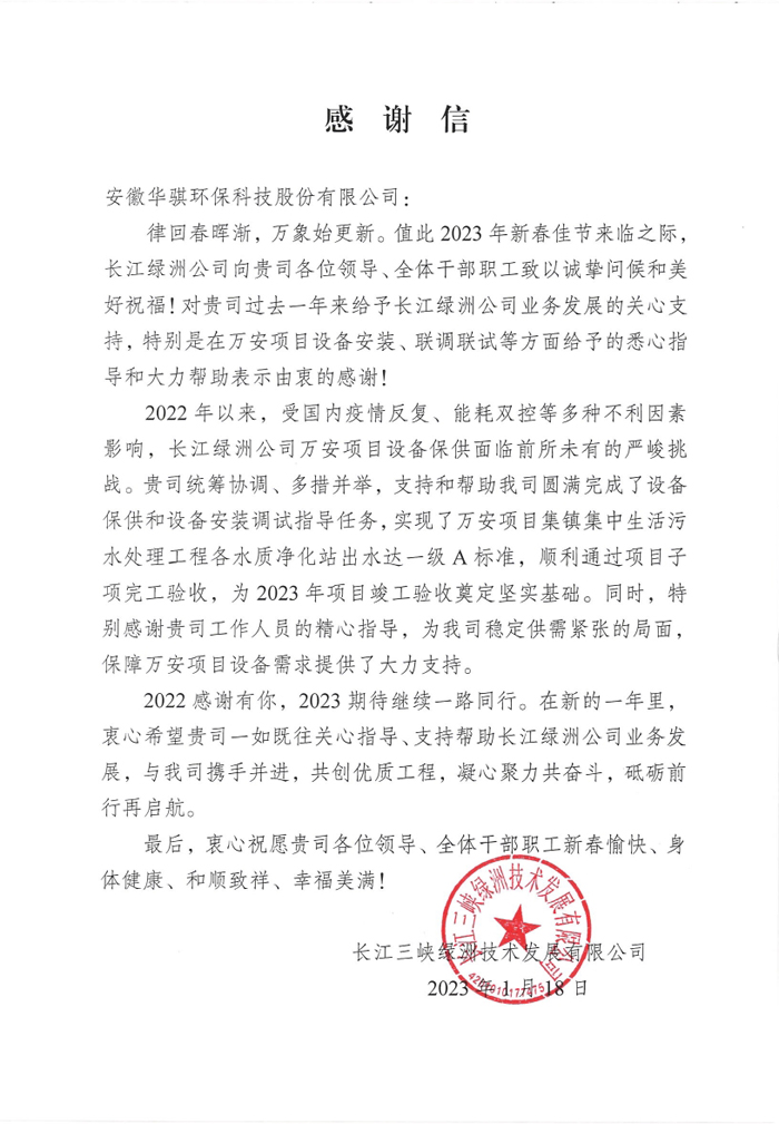 1月18日,長(zhǎng)江三峽綠洲技術(shù)發(fā)展有限公司向安徽華騏環(huán)??萍脊煞萦邢薰景l(fā)來(lái)感謝信,對(duì)華騏環(huán)保積極參與江西省萬(wàn)安縣城鄉(xiāng)水環(huán)境治理項(xiàng)目15個(gè)鄉(xiāng)鎮(zhèn)一體化污水處理設(shè)備安裝、聯(lián)調(diào)聯(lián)試等方面工作給予的悉心指導(dǎo)和大力幫助表示高度贊揚(yáng)與衷心感謝。