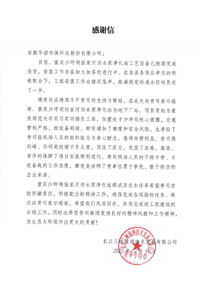 近日,長江三峽綠洲技術發(fā)展有限公司向安徽華騏環(huán)??萍脊煞萦邢薰景l(fā)來感謝信,對華騏環(huán)保工作人員在建設重慶沙坪壩伍家河溝水質凈化站項目過程中,高效、有序的保障了項目順利安裝表示高度贊揚與衷心感謝。
