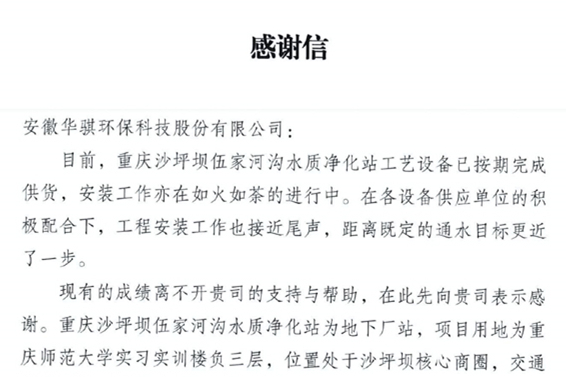 近日,長江三峽綠洲技術(shù)發(fā)展有限公司向安徽華騏環(huán)??萍脊煞萦邢薰景l(fā)來感謝信,對華騏環(huán)保工作人員在建設(shè)重慶沙坪壩伍家河溝水質(zhì)凈化站項目過程中,高效、有序的保障了項目…